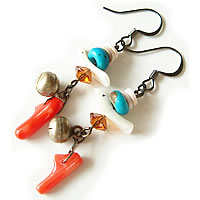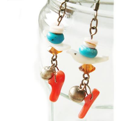 赤の珊瑚、ブルーのトルコ石をつなげて作った夏らしいピアスです。ポイントは、鈴と、アンティークビーズの上にちょこんとお座りしている貝の鳥さん。揺れる度に、鈴がチャリ〜ンと鳴ります♪