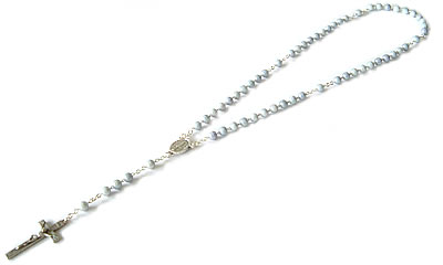 パリの教会で見つけた淡いブルーの素敵なロザリオです。ロザリオは、祈りの回数を数えるための道具ですが、アクセサリーとして身につけてもステキです。残念ながら、輪のサイズが小さい為、首からかける事が出来ません。お子様用か、お守りとしてお使い下さい。