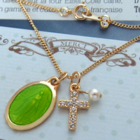 2017年のトレンドカラー「Greenery」を意識した「若草色の不思議のメダイ」と「カットガラス付クロス」、「スワロフスキー(クリスタルパール)」そして「チェーン(45cm)」をセットにした当店オリジナルのネックレスです。